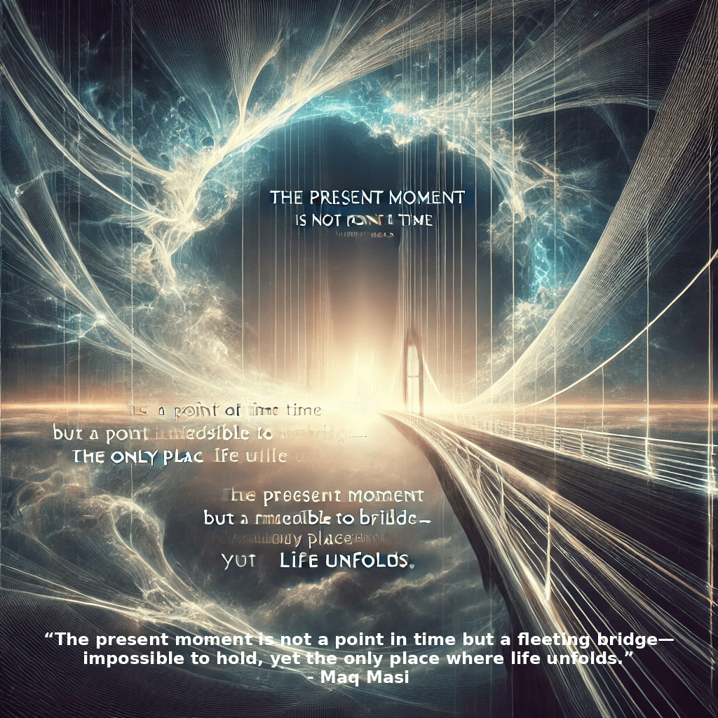 “The present moment is not a point in time but a fleeting bridge—impossible to hold, yet the only place where life unfolds.” – Maq Masi
