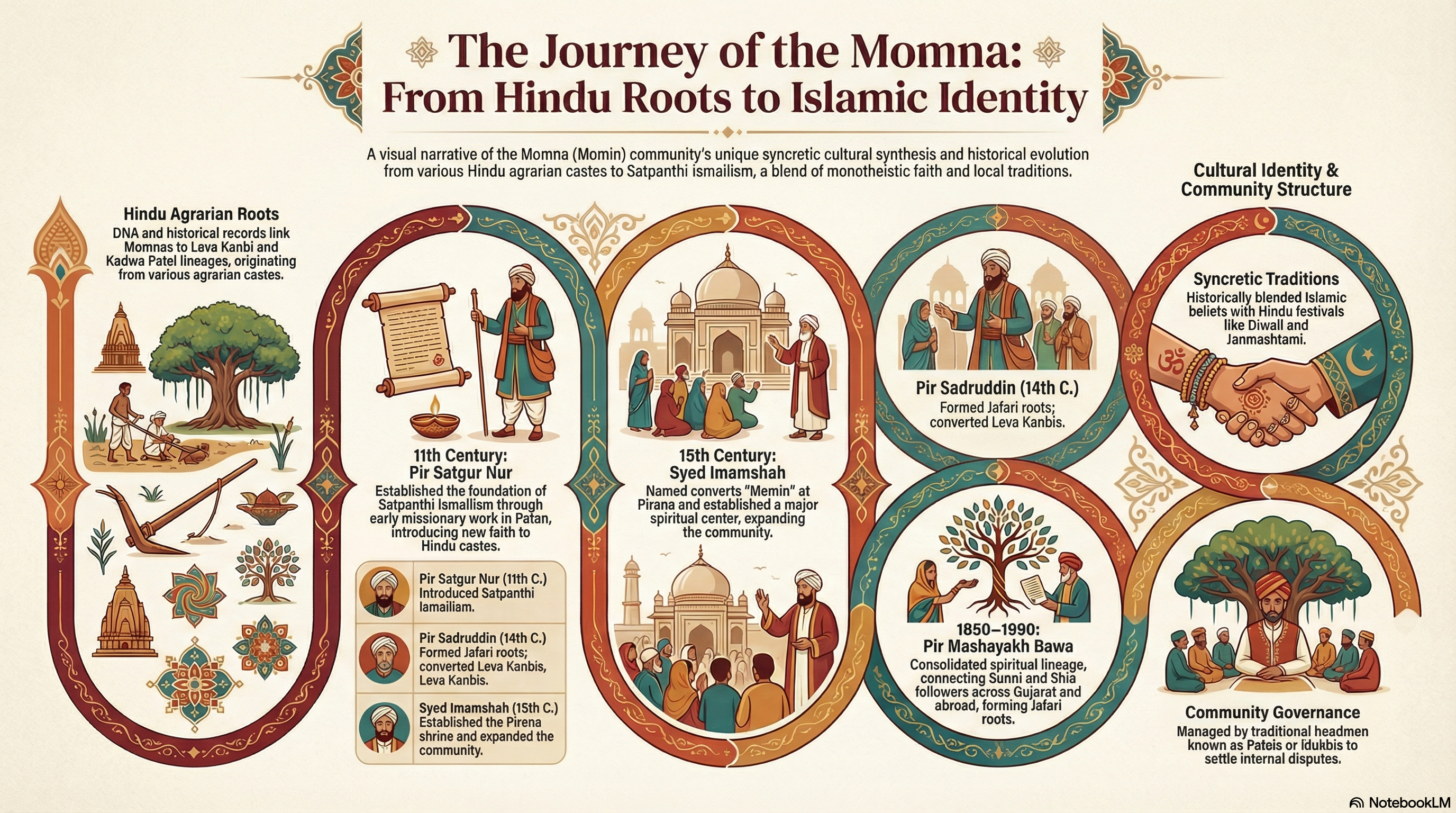 The Momna (Momin) community of Gujarat embodies a rich cultural synthesis, born from the conversion of various Hindu castes, notably Leva, kadwa, Anjana, Matiya Kanbis, to Islam through missionaries like Pir Satgur Nur, Pir Sadruddin, Pir Hasan Kabiruddin, and Syed Imamshah. Their syncretic practices, documented in the Gazetteer, blend Hindu and Islamic traditions, while their presence across Gujarat and beyond, amplified by the legacies of Syed Imamshah’s Pirana shrine and Pir Mashayakh Bawa, reflects religious diversity. As farmers, weavers, and headmen, the Momnas have navigated economic and political challenges, preserving a heritage that continues to inspire communities in Sabarkantha, Mehsana, Ahmedabad, Saurashtra, and the global diaspora.