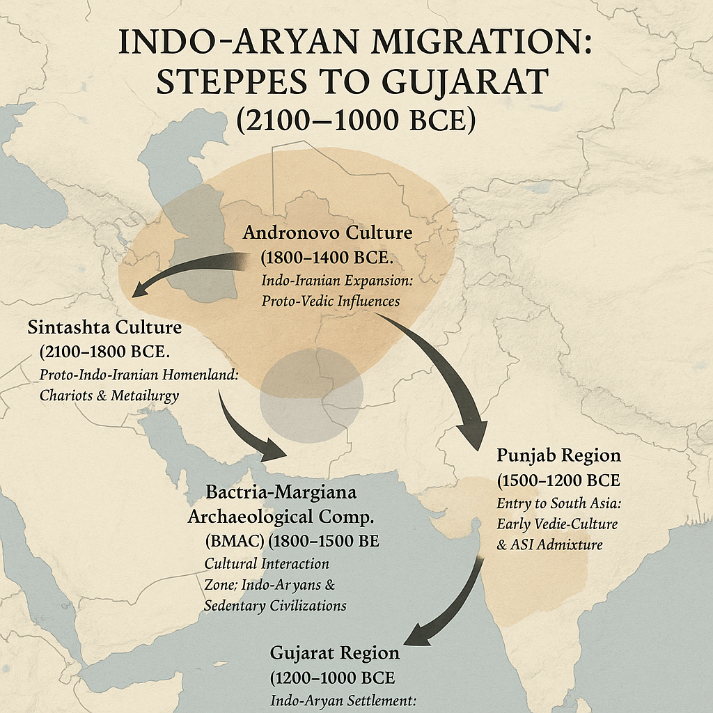 - Gujarat (1200–1000 BCE): Indo-Aryans spread to Gujarat (~20–24°N, 68–74°E), intermixing with indigenous agrarian communities, likely Kanbi ancestors, shaping the Patels’ mixed ancestry (Shah, 1982, p. 10).