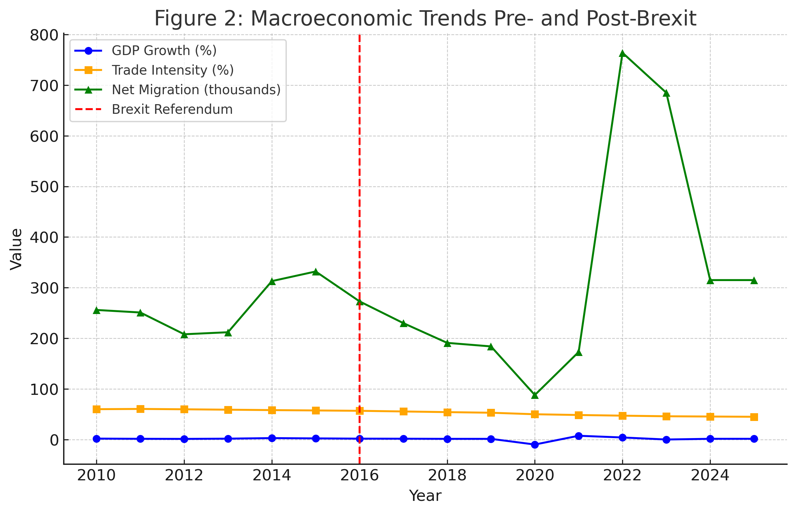 Figure 2: Comparative Chart of GDP growth, trade intensity, and net migration pre- and post-Brexit (Source: ONS, IMF DOTS, World Bank WDI)