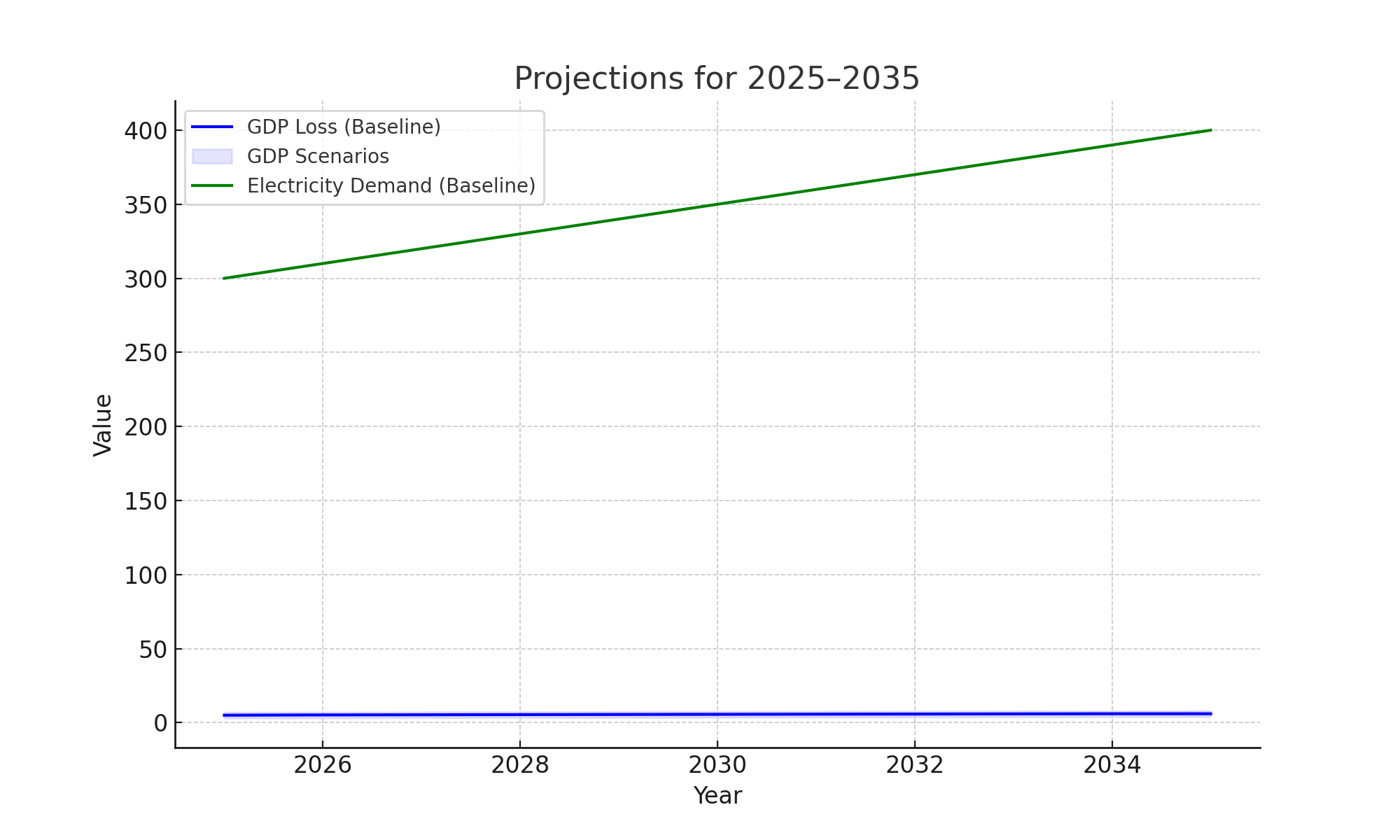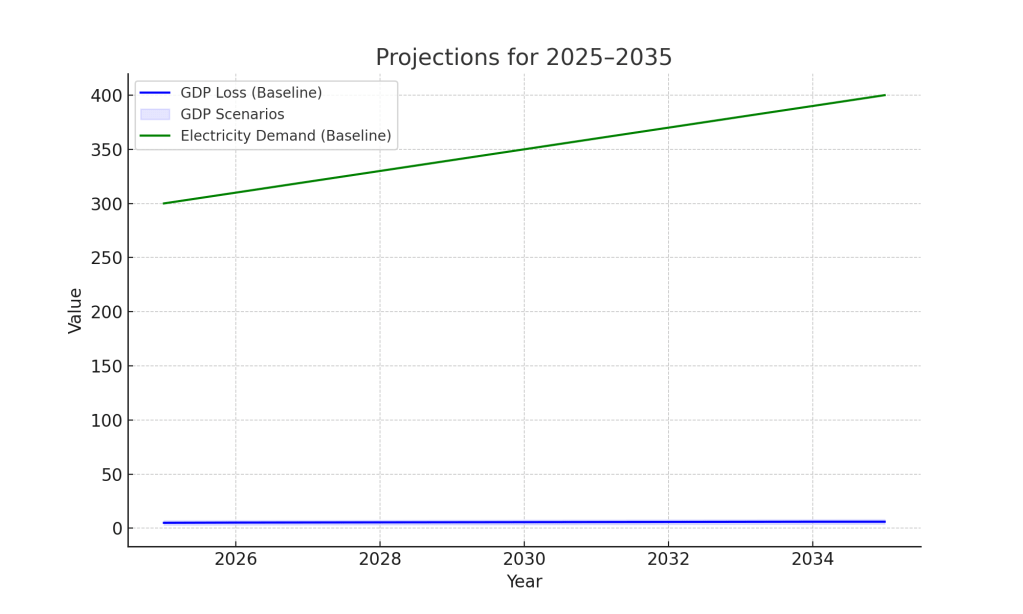 Figure 4: Forecast Chart projecting GDP loss and electricity demand for 2025–2035 under baseline, best-case, and worst-case scenarios (Source: IMF WEO, OBR, DESNZ)