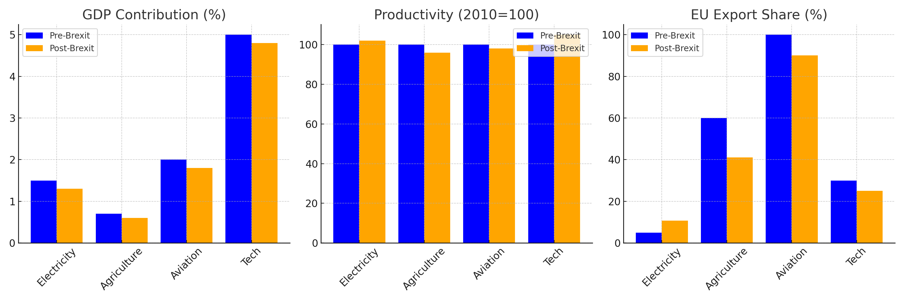 Figure 1: Sectoral Dashboard – Bar charts comparing pre-Brexit GDP contributions, trade volumes, and productivity across sectors (data: ONS, IMF, World Bank).